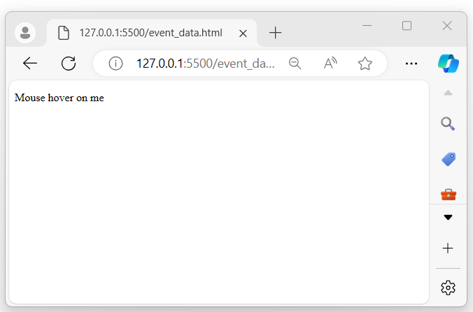 以上程式顯示一條訊息,當滑鼠指標懸停在其上時,瀏覽器螢幕上會出現一個彈出警報,顯示傳遞給事件處理程式的資料值:
