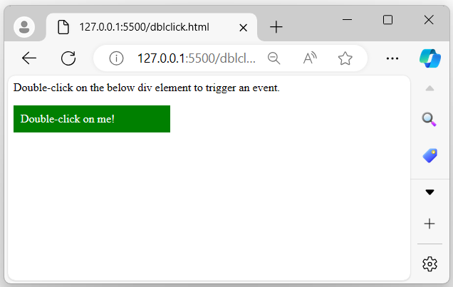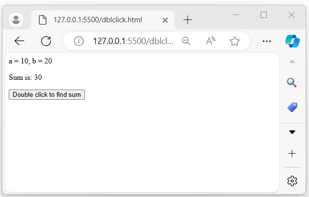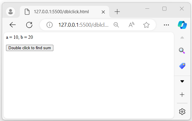 <html> <head> <script type = "text/javascript" src = "https://tutorialspoint.tw/jquery/jquery-3.6.0.js"> </script> </head> <body> <span></span> <p></p> <button>Double click to find sum</button> <script> let a = Number(10); let b = Number(20); document.querySelector('span').innerHTML = "a = " + a + ", b = " + b; $('button').dblclick(function(){ document.querySelector('p').innerHTML = "Sum is: " + (a + b); }); </script> </body> </html>