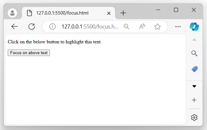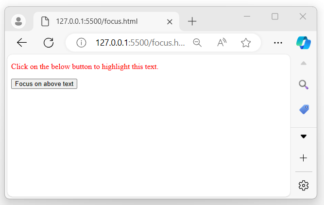 <!DOCTYPE html> <html> <head> <script src="https://ajax.googleapis.com/ajax/libs/jquery/1.7/jquery.min.js"></script> </head> <body> <p>Click on the below button to highlight this text.</p> <button>Focus on above text</button> <script> $('button').focus(function(){ $('p').css("color", "red"); }); </script> </body> </html>