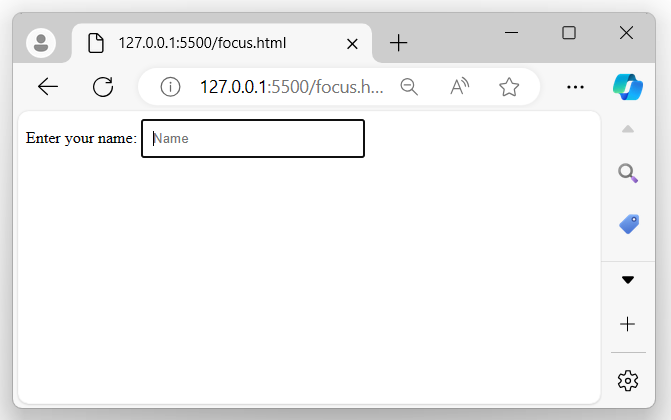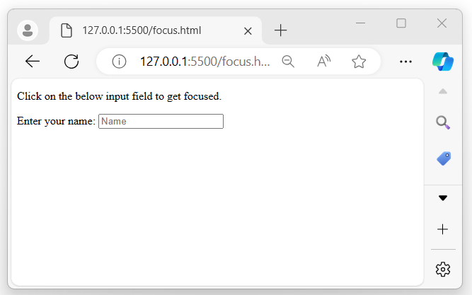 <!DOCTYPE html> <html> <head> <script src="https://ajax.googleapis.com/ajax/libs/jquery/1.7/jquery.min.js"></script> <style> input{ width: 200px; padding: 10px 10px; } </style> </head> <body> <label for="">Enter your name: </label> <input type="text" placeholder="Name"> <script> $('input').focus(); </script> </body> </html>