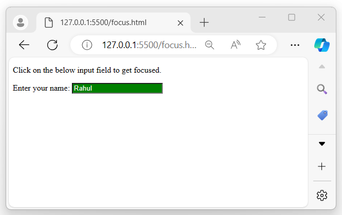 <!DOCTYPE html> <html> <head> <script src="https://ajax.googleapis.com/ajax/libs/jquery/1.7/jquery.min.js"></script> </head> <body> <p>Click on the below input field to get focused.</p> <label for="">Enter your name: </label> <input type="text" placeholder="Name"> <script> $('input').focus(function(){ $(this).css({"background-color":"green", "color":"white"}); }); </script> </body> </html>