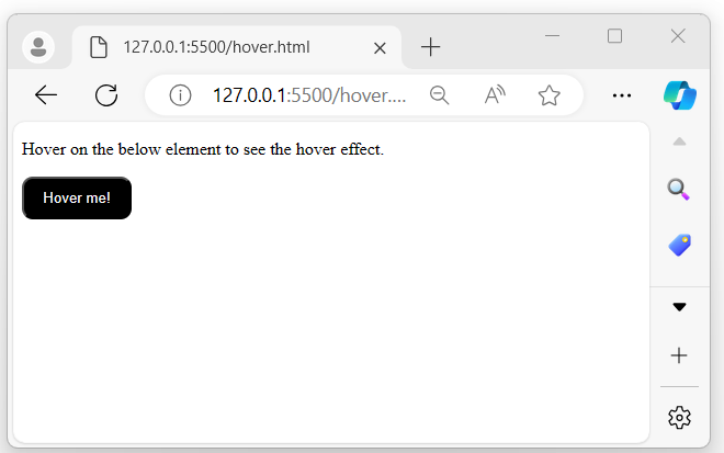 執行上述程式後,它將顯示一個具有黑色背景顏色的按鈕。當用戶將滑鼠懸停在其上時,寬度將擴充套件到 200px,背景顏色將更改為綠色: