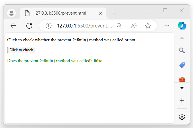 <!DOCTYPE html> <html> <head> <script src="https://ajax.googleapis.com/ajax/libs/jquery/3.6.0/jquery.min.js"></script> </head> <body> <p>Click to check whether the preventDefault() method was called or not.</p> <button>Click to check</button><br><br> <span></span> <script> $('button').click(function(event) { if(event.isDefaultPrevented){ $('span').text("Does the preventDefault() method was called? " + event.isDefaultPrevented()); $('span').css("color", "green"); } }); </script> </body> </html>