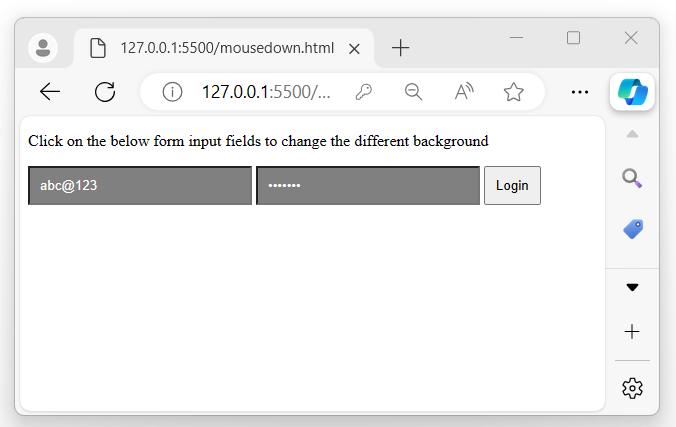<!DOCTYPE html> <html> <head> <script src="https://ajax.googleapis.com/ajax/libs/jquery/1.7/jquery.min.js"></script> <style> input{ width: 200px; padding: 10px; } button{ padding: 10px; } </style> </head> <body> <p>Click on the below form input fields to change the different background</p> <form> <input type="text" placeholder="Username"> <input type="password" placeholder="Password"> <button>Login</button> </form> <script> $('input').mousedown(function(){ $('input').css({"background-color" : "gray", "color": "white"}); }); </script> </body> </html>