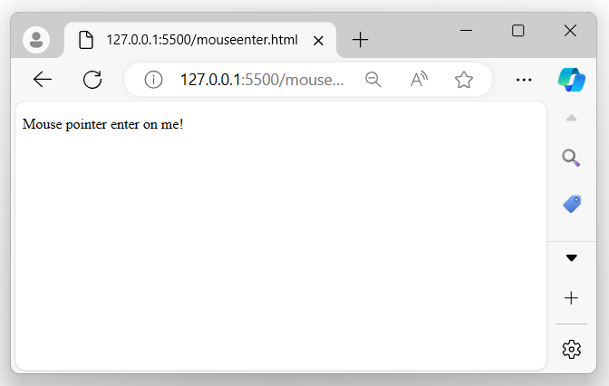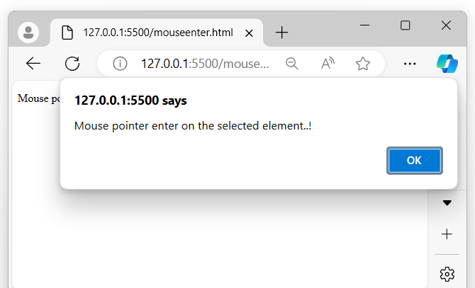 以上程式會在滑鼠指標進入(或懸停)顯示的訊息時顯示一條訊息,瀏覽器螢幕上會出現一個彈出警報: