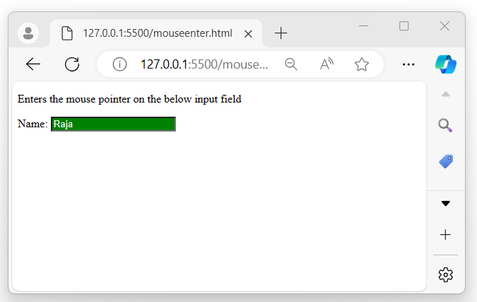 以下是 jQuery 事件mouseenter() 方法的另一個示例。在這裡,當滑鼠指標進入(或懸停)輸入欄位時,我們更改輸入欄位的背景顏色: