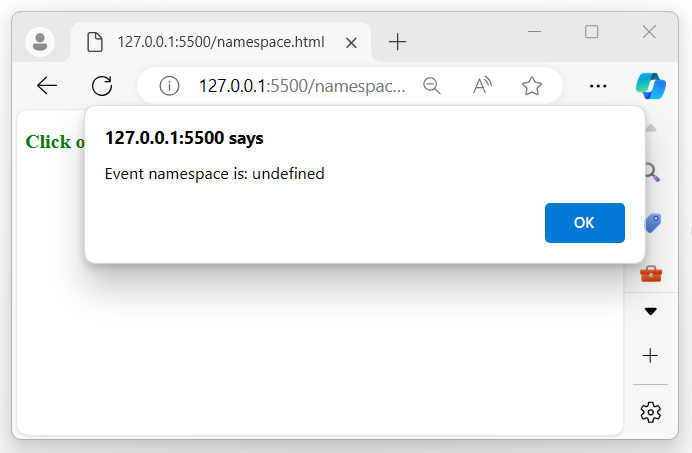 <!DOCTYPE html> <html> <head> <script src="https://ajax.googleapis.com/ajax/libs/jquery/3.6.0/jquery.min.js"></script> <style> p{ font-size: 20px; color: green; font-weight: bold; } </style> </head> <body> <p>Click on me</p> <script> $("p").on("click.TutorialsPoint", function(event) { alert("Event namespace is: " + event.namespace); }); </script> </body> </html>