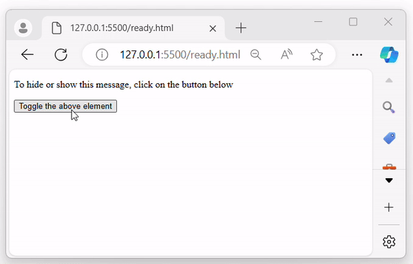 執行上述程式後,將顯示段落 (p) 和按鈕元素。單擊按鈕時,段落元素將在隱藏和顯示之間切換: