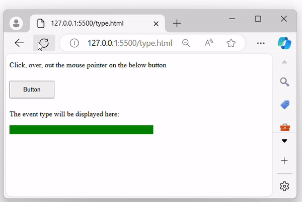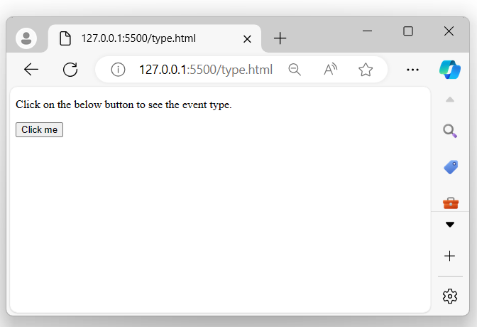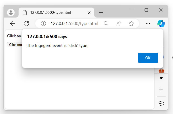 程式顯示一個按鈕,單擊時,瀏覽器螢幕上會出現一個彈出警報,顯示按鈕元素觸發的事件型別,如下所示:
