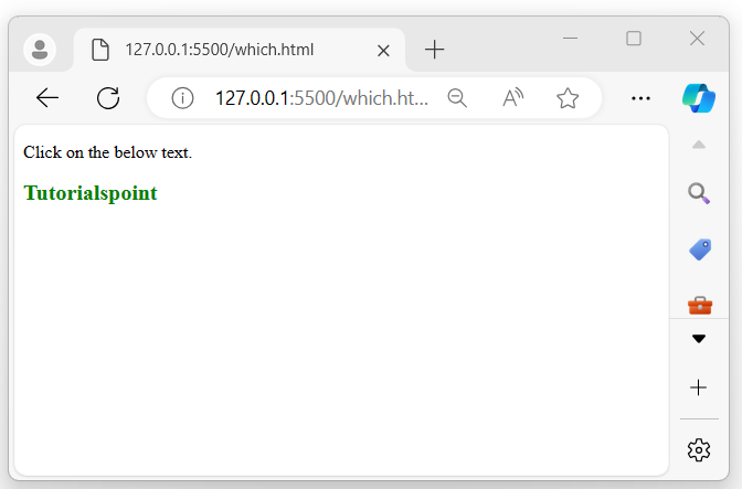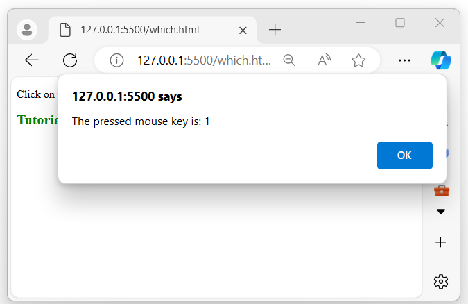 以上程式顯示了一個包含一些文字的 p 元素,當滑鼠指標單擊它時,瀏覽器螢幕上將出現一個彈出警報,顯示您按下了哪個滑鼠按鈕: