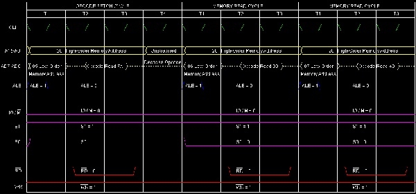 **總結** - 因此,此指令 **JM** 需要 3 個位元組、3 個機器週期(操作碼獲取、記憶體讀取、記憶體讀取)和 10 個 T 狀態才能執行,如時序圖所示。