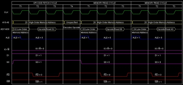 **總結** - 因此,此指令 **JNC** 需要 3 個位元組、3 個機器週期(操作碼獲取、記憶體讀取、記憶體讀取)和 10 個 T 狀態才能執行,如時序圖所示。