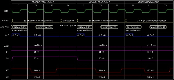 **總結** − 因此,此指令JPE需要3個位元組、3個機器週期(操作碼提取、記憶體讀取、記憶體讀取)和10個T狀態才能執行,如時序圖所示。