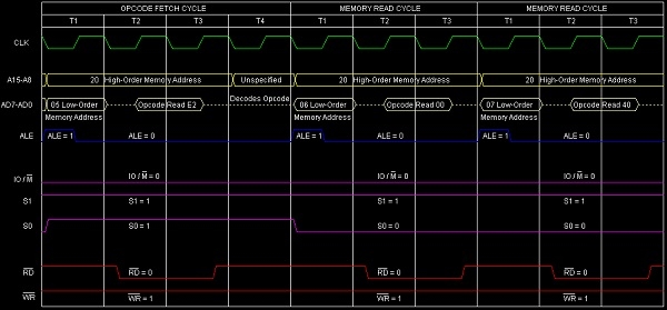 **總結** - 因此,此指令 **JPO** 需要 3 個位元組、3 個機器週期(操作碼獲取、記憶體讀取、記憶體讀取)和 10 個 T 狀態才能執行,如時序圖所示。