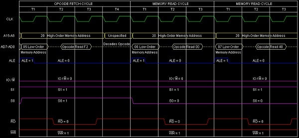**總結** - 因此,此指令 **JP** 需要 3 個位元組、3 個機器週期(操作碼獲取、記憶體讀取、記憶體讀取)和 10 個 T 狀態才能執行,如時序圖所示。