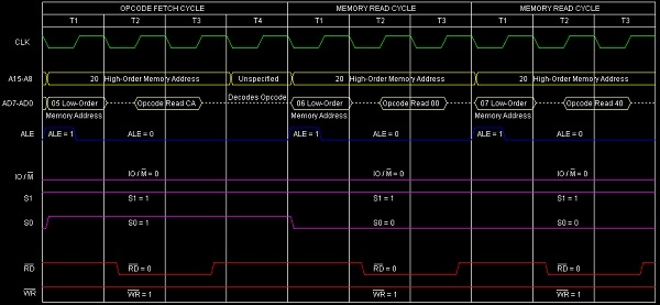 **總結** - 因此,此指令 **JZ** 需要 3 個位元組、3 個機器週期(操作碼獲取、記憶體讀取、記憶體讀取)和 10 個 T 狀態才能執行,如時序圖所示。