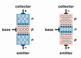 電晶體是微小的電子元件,主要有兩個用途。它們可以充當開關來控制電路,並放大訊號。每個電晶體都具有特定的電壓和電流額定值。現代電晶體通常有三個引腳,分別代表電晶體的發射極、基極和集電極。發射極、基極和集電極分別用這些字母表示。左側的任何型別的電晶體都有一個平邊。NPN 和 PNP 是兩種主要的雙極型電晶體。