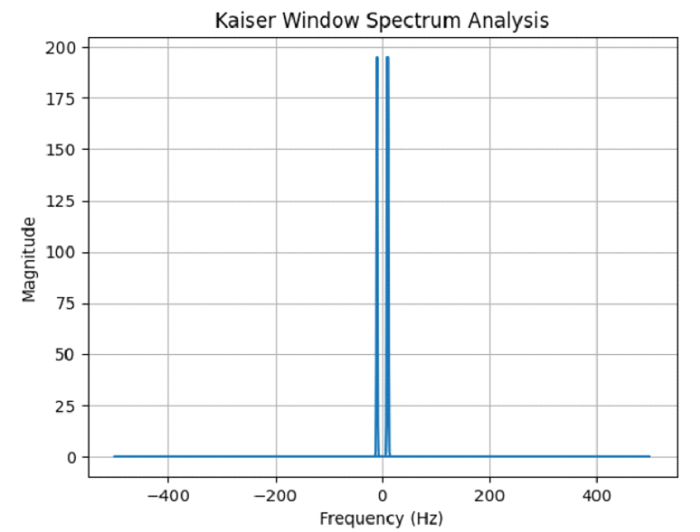 應用 Kaiser 窗後,正弦訊號的頻譜圖將是提供的程式碼的輸出。圖表的縱軸顯示頻譜的幅度,而橫軸表示以 Hz 為單位的頻率。