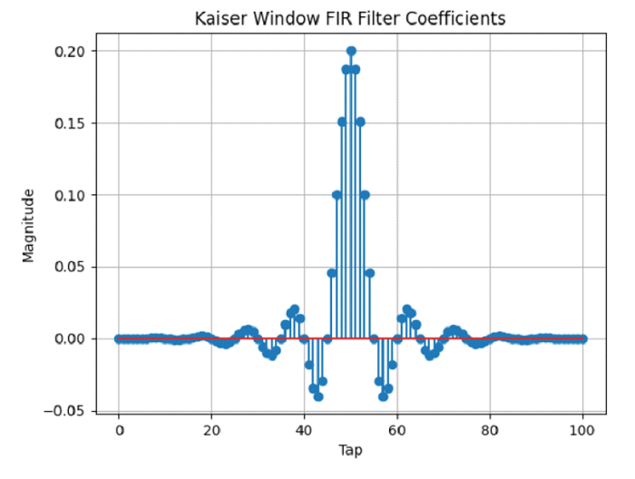 在此方法中,Kaiser 窗用於設計有限脈衝響應 (FIR) 濾波器。我們指定所需的截止頻率、取樣頻率和濾波器階數。將 Kaiser 窗應用於 scipy.signal.firwin 函式以生成濾波器係數。然後透過繪製生成的濾波器係數來顯示頻率響應特性。