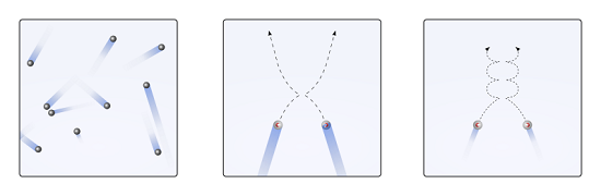 這些碰撞是完全彈性的,幾乎是瞬時的(持續時間很短),分子在碰撞之間以直線運動並獲得均勻的速度。