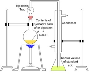 **消化** - 凱氏定氮法中涉及的第一步是消化過程,其中樣品在濃硫酸存在下於 360–410°C 的高溫下加熱。有機樣品在酸的幫助下在此過程中被破壞或消化。並進一步導致硫酸銨的形成。