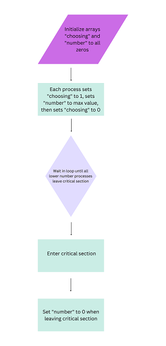 該演算法透過為每個請求訪問資源的程序或執行緒分配號碼,然後比較這些號碼的值來確定它們被服務的順序。資源首先被分配給號碼最小的程序。
