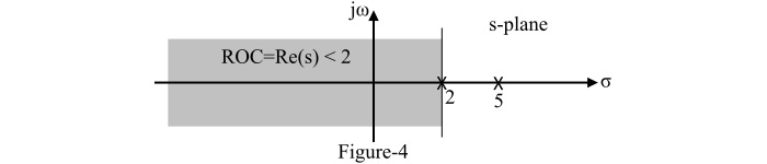 給定訊號的拉普拉斯變換的 ROC 如圖 2 所示。需要注意的是,ROC 延伸到最右極點的右側,並且 ROC 內不存在極點。