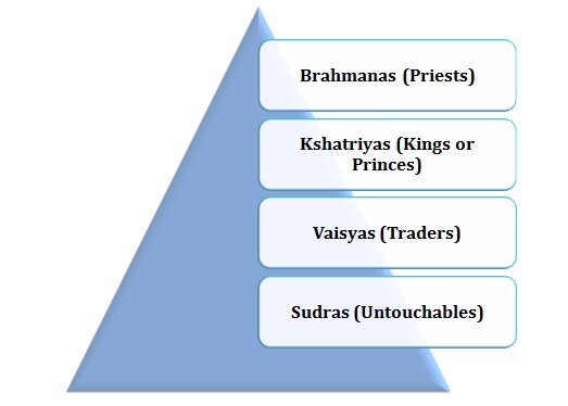 答:四個種姓是婆羅門、剎帝利、吠舍和首陀羅。婆羅門位於社會頂層,支援剎帝利,後者主要是國王或王子。吠舍負責貿易和商業,而首陀羅則基本上位於社會底層,幾乎被視為不可接觸者。