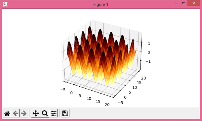 from matplotlib import pyplot as plt import numpy as np plt.rcParams["figure.figsize"] = [7.00, 3.50] plt.rcParams["figure.autolayout"] = True delta = 0.025 xrange = np.arange(-5.0, 20.0, delta) yrange = np.arange(-5.0, 20.0, delta) x, y = np.meshgrid(xrange, yrange) fig = plt.figure() ax = fig.gca(projection='3d') ax.contour(x, y, (np.sin(x) - np.cos(y)), [0]) ax.plot_surface(x, y, (np.sin(x) - np.cos(y)), cmap="afmhot_r") plt.show()