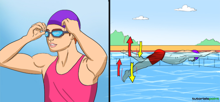 潛水時,護目鏡也很有用。為了防止水進入護目鏡,請確保戴緊。如下圖所示,練習踢腿最安全的方法是抓住泳池邊緣。