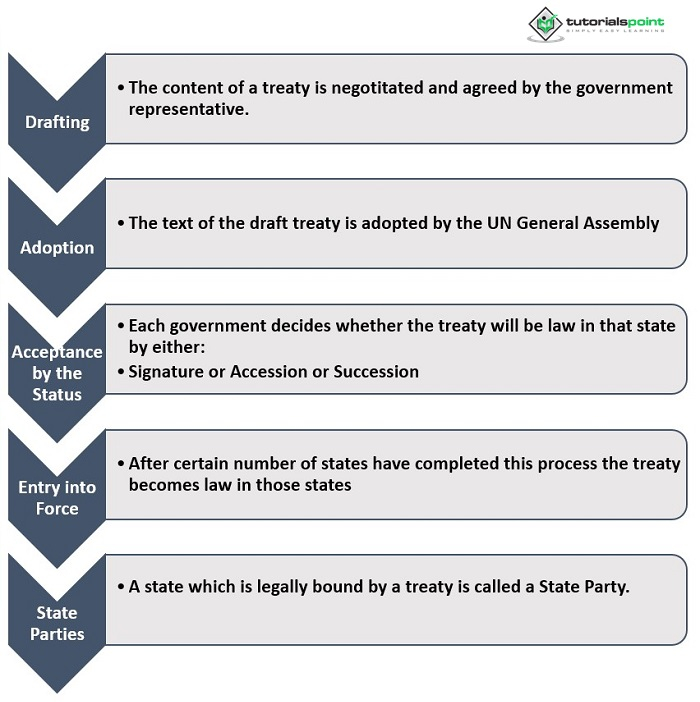 雙邊和多邊書面協議用於制定新的國際法律標準。出於政治原因,各國越來越不願意依賴習慣國際法來規範法律事務。新技術和不斷增長的國際交流已經確立了對更加精確和靈活的國際法的需求,而習慣法無法令人滿意地滿足這一需求。因此,具有約束力的條約將足以滿足現代領域的所有要求。所有型別的國際協議,包括公約、條約、一般法案、憲章、法律、宣言、盟約、議定書和協議,都稱為“條約”。