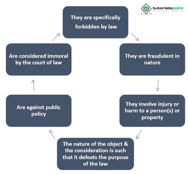 在公司法中,合法的物件是不應違反公共政策的物件。公共政策旨在維護和捍衛社群的整體福祉,而不是限制任何個人的權利。以下型別的合同被視為違反公共政策 -