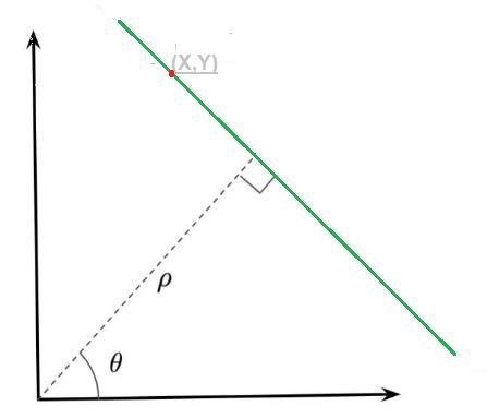 一條直線可以用方程表示——或者可以用引數形式表示為,其中(ρ)是原點到直線的垂直距離,而ϴ是這條垂直線與水平軸形成的角度,以逆時針方向測量(OpenCV 使用這種表示方法)。請檢視下圖