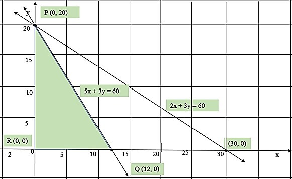 約束線 $\mathrm{5x\:+\:3y\:=\:60}$ 與座標軸在 (12, 0) 和 (0, 20) 處相交。因此,位於直線區域下方的任何點都滿足 $\mathrm{5x\:+\:3y\:\leq\:60}$