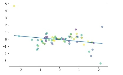 #Simple linear regression import numpy as np import matplotlib.pyplot as plt np.random.seed(1) n = 70 x = np.random.randn(n) y = x * np.random.randn(n) colors = np.random.rand(n) plt.plot(np.unique(x), np.poly1d(np.polyfit(x, y, 1))(np.unique(x))) plt.scatter(x, y, c = colors, alpha = 0.5) plt.show()