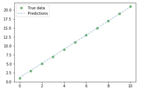 #Purely inference predicted = model(Variable(torch.from_numpy(x_train))).data.numpy() predicted y_train #Plot Graph #Clear figure plt.clf() #Get predictions predicted = model(Variable(torch.from_numpy(x_train))).data.numpy() #Plot true data plt.plot(x_train, y_train, 'go', label ='True data', alpha = 0.5) #Plot predictions plt.plot(x_train, predicted, '--', label='Predictions', alpha = 0.5) #Legend and Plot plt.legend(loc = 'best') plt.show()