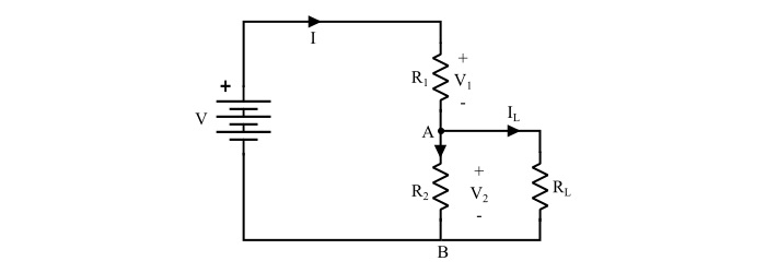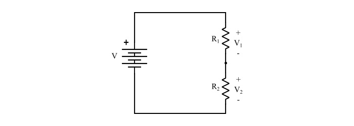 考慮如下所示的分壓器電路,其中從V伏特的單個輸入電壓源獲得兩個降低的電壓V1和V2。由於沒有負載連線到電路,因此稱為無載分壓器。