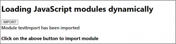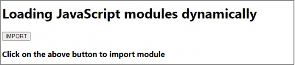 <!DOCTYPE html> <html lang="en"> <head> <meta charset="UTF-8" /> <meta name="viewport" content="width=device-width, initial-scale=1.0" /> <title>Document</title> <style> body { font-family: "Segoe UI", Tahoma, Geneva, Verdana, sans-serif; } .result { font-size: 18px; font-weight: 500; } </style> </head> <body> <h1> Loading JavaScript modules dynamically</h1> <button class="Btn">IMPORT</button> <div class="result"></div> <h3>Click on the above button to import module</h3> <script src="script.js" type="module"></script> <script src="sample.js" type="module"></script> </body> </html>