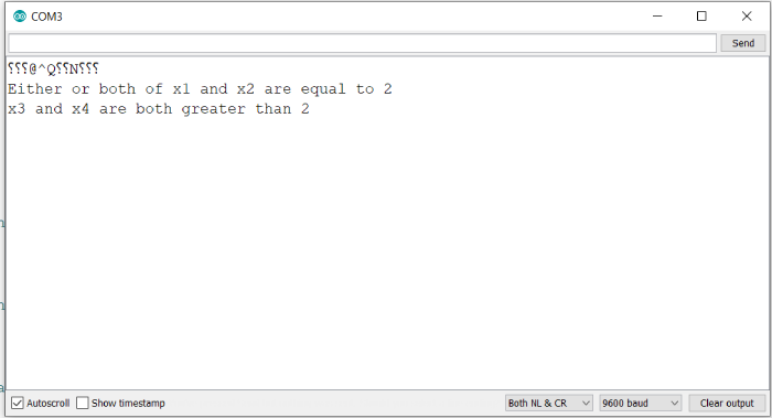 void setup() { // put your setup code here, to run once: Serial.begin(9600); Serial.println(); int x1 = 1; int x2 = 2; int x3 = 3; int x4 = 4; if((x1 > 2) && (x2 < 2)){ Serial.println("x1 is greater than 2 and x2 is less than 2"); } if((x1 == 2) || (x2 == 2)){ Serial.println("Either or both of x1 and x2 are equal to 2"); } if((x3 > 2) && (x4 > 2)){ Serial.println("x3 and x4 are both greater than 2"); } if((x3 < 2) || (x4 < 2)){ Serial.println("Either or both of x3 and x4 are less than 2"); } } void loop() { // put your main code here, to run repeatedly: }