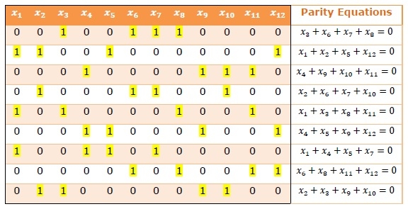 此示例說明了一個 (12, 3, 4) LDPC 矩陣,即 n = 12,j = 3,k = 4。這意味著每個方程作用於 4 個碼符號,每個碼符號出現在 3 個方程中。與漢明碼的奇偶校驗矩陣不同,此碼在校驗位中沒有任何對角線上的 1。