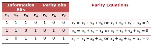以下奇偶校驗矩陣是具有 n = 7 的漢明碼,其中包含 4 個資訊位,後跟 3 個偶校驗位。校驗位位於對角線上。奇偶校驗方程如下所示:
