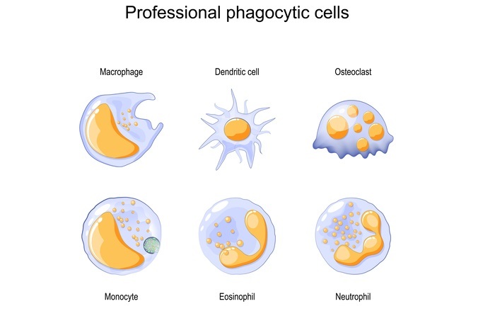 另一方面,枯否細胞是專門的巨噬細胞,起源於胎肝祖細胞,負責過濾肝臟中的血液。專業吞噬細胞是免疫細胞,專門識別和吞噬外來顆粒,例如細菌、病毒和碎片,這一過程稱為吞噬作用。