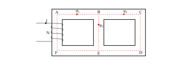 考慮線圈 N 匝繞線上路 AF 上,載有 I 安培的電流。線圈建立的磁通量 $\varphi_1$ 在 B 處分成兩條路徑 -