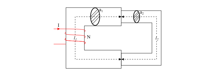 $$\mathrm{總磁阻,S_T=\frac{l_1}{\mu_0\mu_r1a_1}+\frac{l_2}{\mu_0\mu_r2a_2}}$$