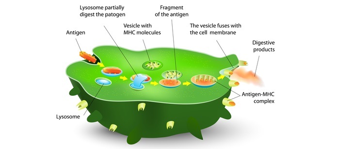 I類MHC分子將抗原肽呈遞給細胞毒性T細胞,而II類MHC分子將抗原肽呈遞給輔助性T細胞。抗原呈遞過程始於抗原呈遞細胞吞噬病原體,將其分解成抗原肽,並將這些肽載入到MHC分子上。然後,MHC分子遷移到細胞表面,在那裡將抗原肽呈遞給T細胞。