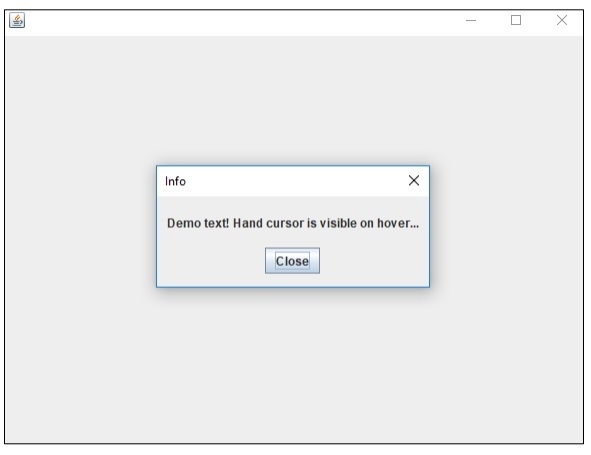 }輸出如下。當您將游標保持在 Dialog 文字“示例文字!滑鼠懸停時,手形游標可見...”下時,游標會轉換為手形游標