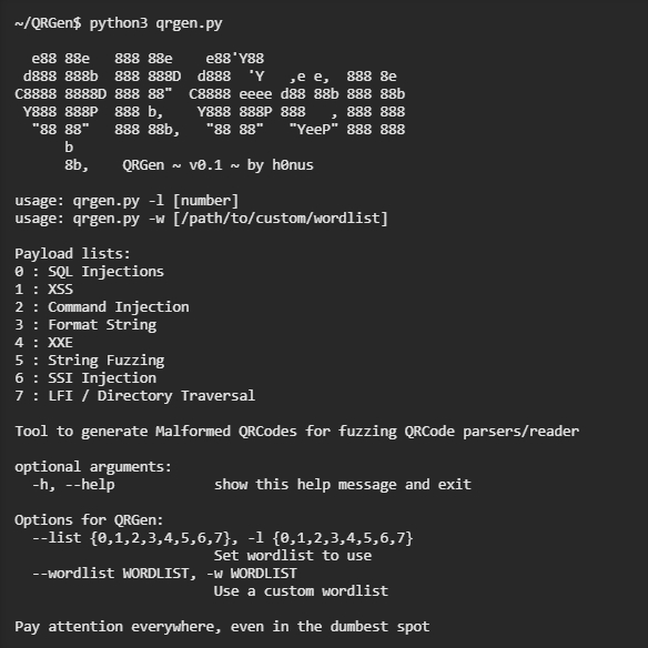 二維碼是機器可讀的資料格式,用於需要自動掃描的任何內容。由於二維碼無處不在,從產品包裝到航空公司登機牌等,因此有可能利用常見的漏洞,將打包在自定義二維碼中的漏洞利用程式加以利用。駭客使用了一個名為 QRGen 的工具來建立惡意二維碼,以攻擊易受攻擊的裝置。二維碼攻擊非常有效,因為人類無法在不掃描的情況下讀取或理解二維碼中包含的資訊,從而可能將任何用於嘗試解讀二維碼的裝置暴露給其中包含的漏洞利用程式。人類在實際掃描之前無法發現惡意二維碼,二維碼相對較大的有效負載可以為駭客帶來優勢,尤其是在與易受攻擊的裝置結合使用時。QRGen 工具將使用 Python 將有效負載編碼到二維碼中。