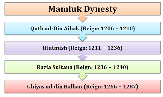 統治印度的馬穆魯克王朝的蘇丹有庫特布丁·艾巴克(公元1206-1210年)、阿拉姆沙阿(公元1210-1211年)、伊爾圖特米什(公元1211-1236年)、魯克努丁·費羅茲(公元1236年)、拉齊亞·丁(公元1236-1240年)、穆伊茲丁·巴赫拉姆(公元1240-1242年)、阿拉烏丁·馬蘇德(公元1242-1246年)、納西爾丁·馬哈茂德(公元1246-1266年)、吉亞斯丁·巴爾班(公元1266-1286年)和穆伊茲丁·穆罕默德·凱卡巴德(公元1286-1290年)。然而,在這些蘇丹中,只有庫特布丁·艾巴克、伊爾圖特米什、拉齊亞·丁和吉亞斯丁·巴爾班是最有作為的。