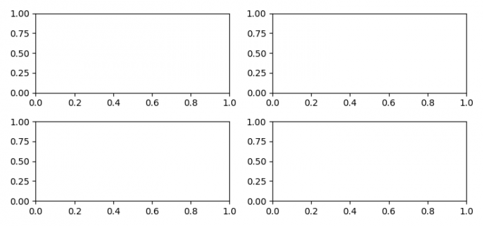 import numpy as np import matplotlib.pyplot as plt plt.rcParams["figure.figsize"] = [7.50, 3.50] plt.rcParams["figure.autolayout"] = True x = np.linspace(0, 2 * np.pi, 400) y = np.sin(x ** 2) fig, ((ax1, ax2), (ax3, ax4)) = plt.subplots(nrows=2, ncols=2) fig.subplots_adjust(hspace=1) plt.show()