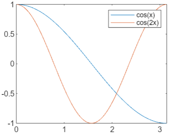 % Create an array of values from 0 to pi x = linspace(0, pi); % Calculate y1 = cos(x) and plot it with a label 'cos(x)' y1 = cos(x); plot(x, y1, 'DisplayName', 'cos(x)') % Hold the current plot to add another plot hold on % Calculate y2 = cos(2x) and plot it with a label 'cos(2x)' y2 = cos(2*x); plot(x, y2, 'DisplayName', 'cos(2x)') % Release the hold to prevent further plots from being added to the current figure hold off % Display the legend with labels for each plot legend